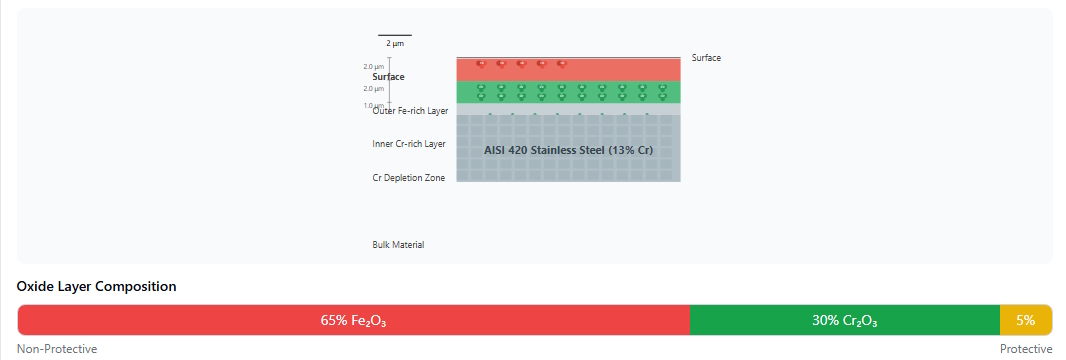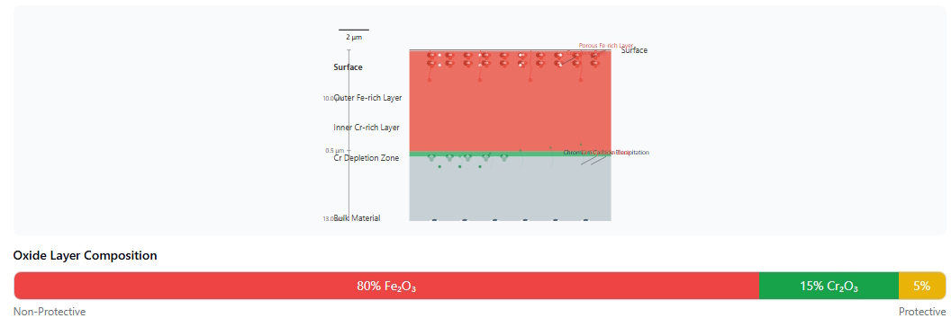 Initial dual-layer oxide structure with balanced Fe₂O₃/Cr₂O₃ ratio and minimal Cr depletion