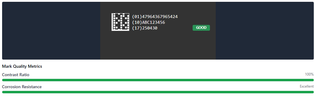 Initial UDI mark shows clear contrast and excellent readability with 100% contrast ratio.