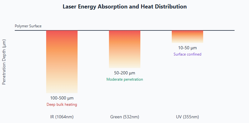 Optical penetration depth (δ) defines how deeply laser energy penetrates into a material before being absorbed. This critical parameter varies dramatically with wavelength and material composition: