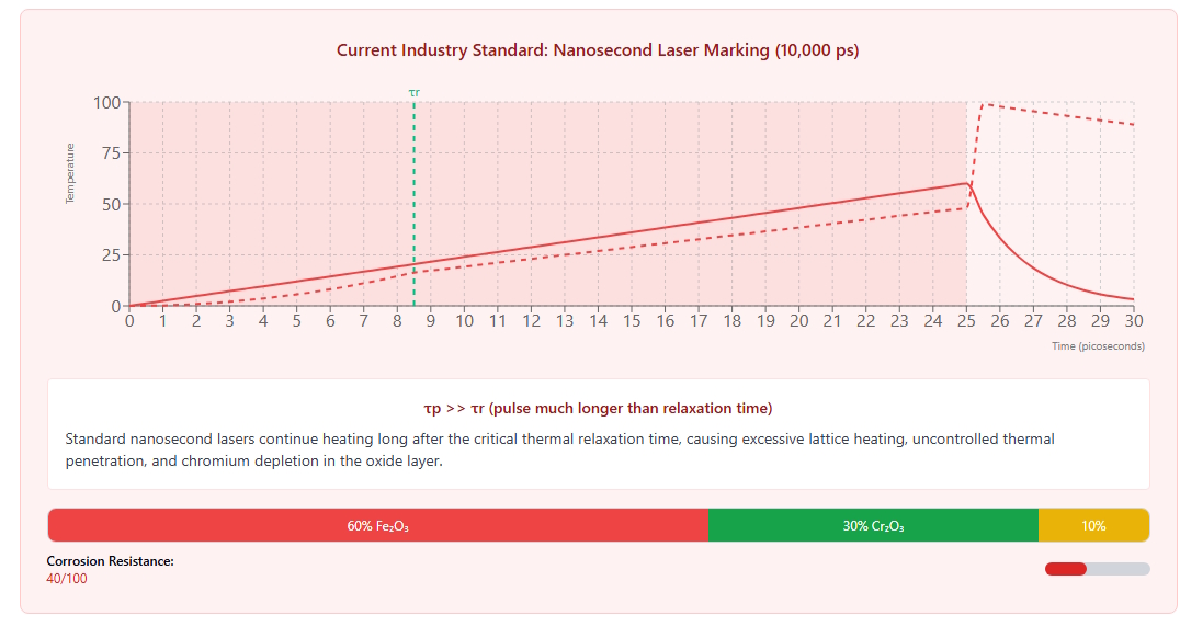 Stainless steel’s corrosion resistance depends on a stable chromium oxide (Cr₂O₃) passive layer. Nanosecond lasers create a chromium-depleted zone around the mark, compromising this protection.